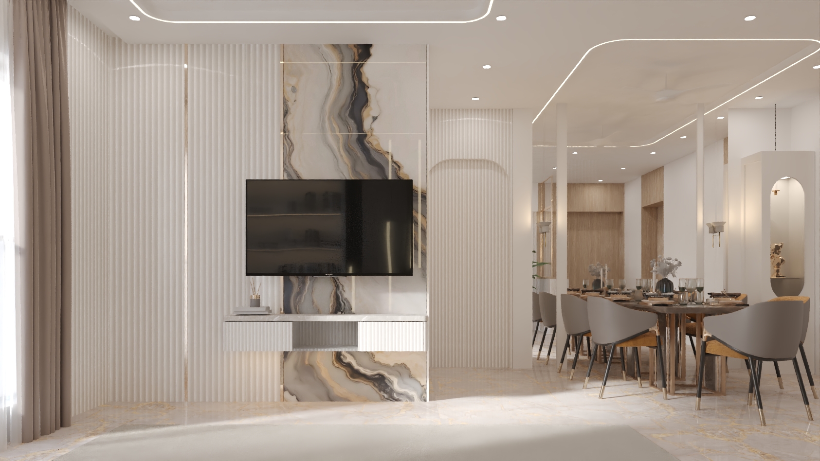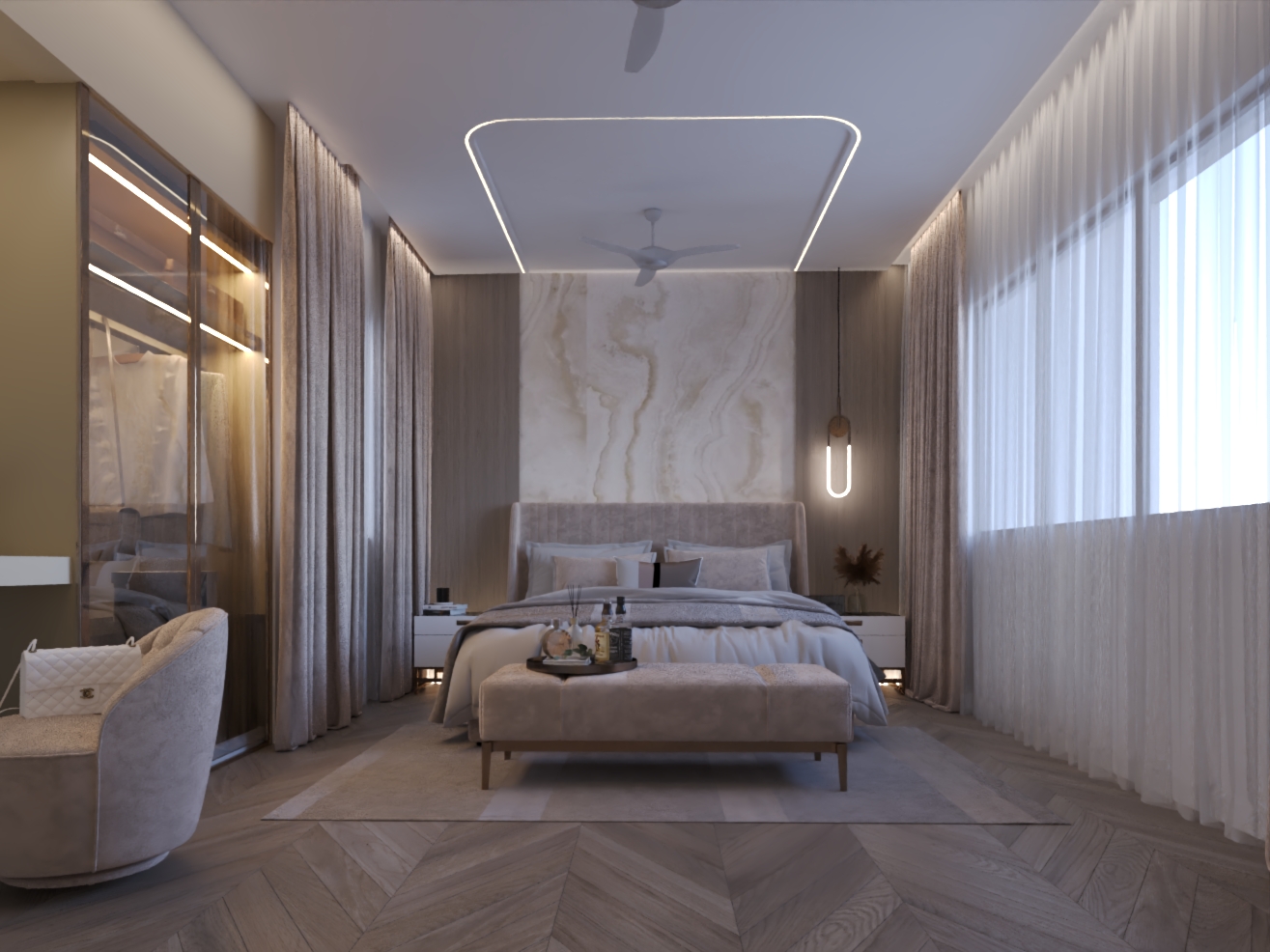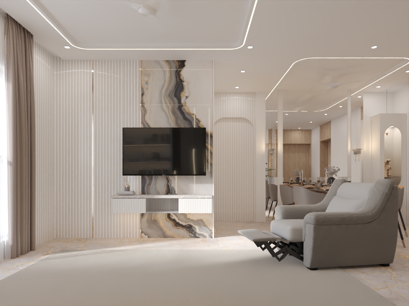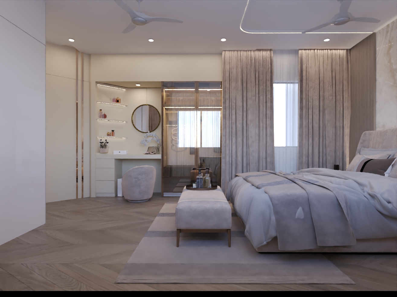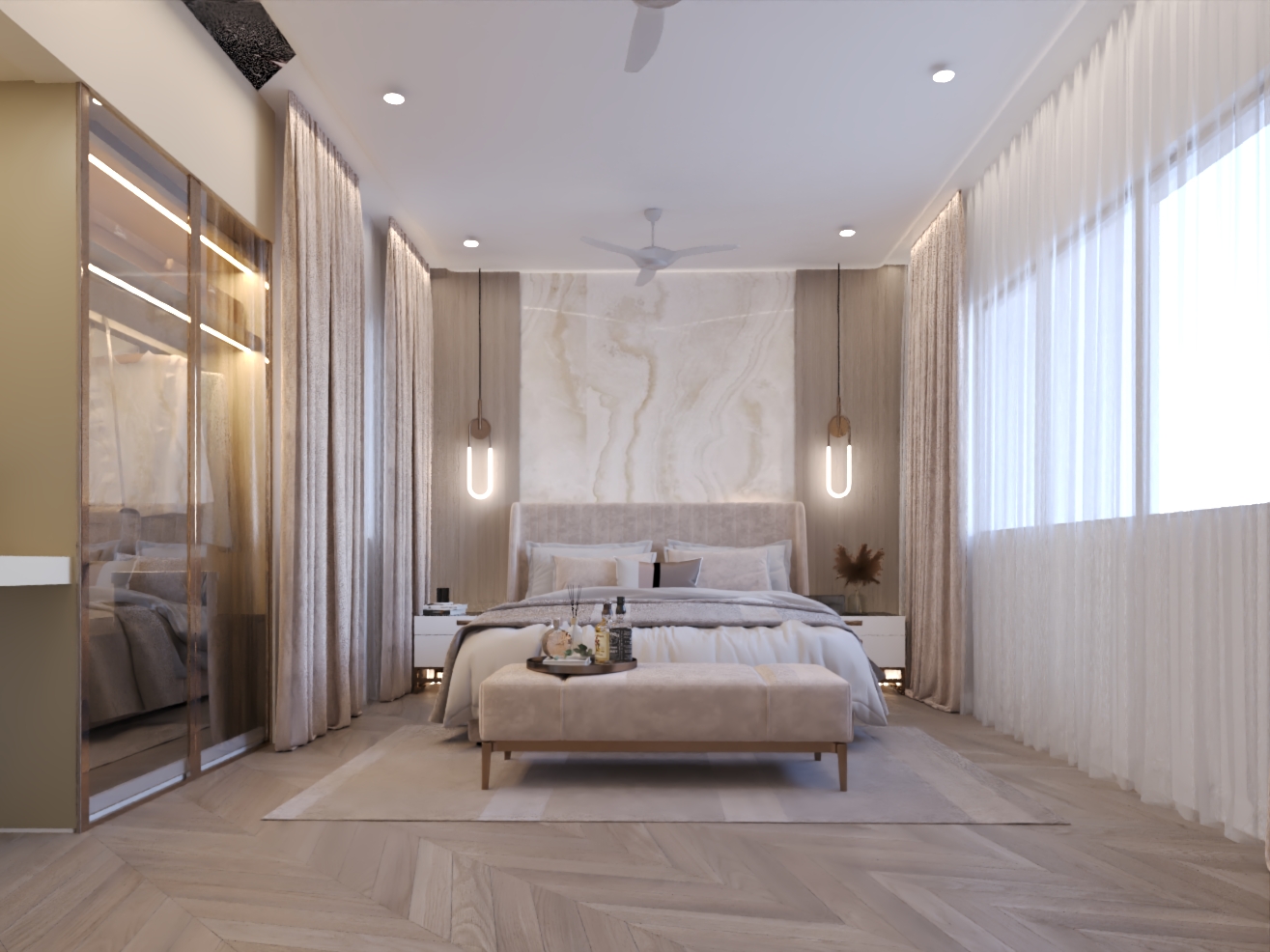 The design language blends soft neutrals, warm textures, and premium materials to create a home that feels expansive, refined, and emotionally comforting.