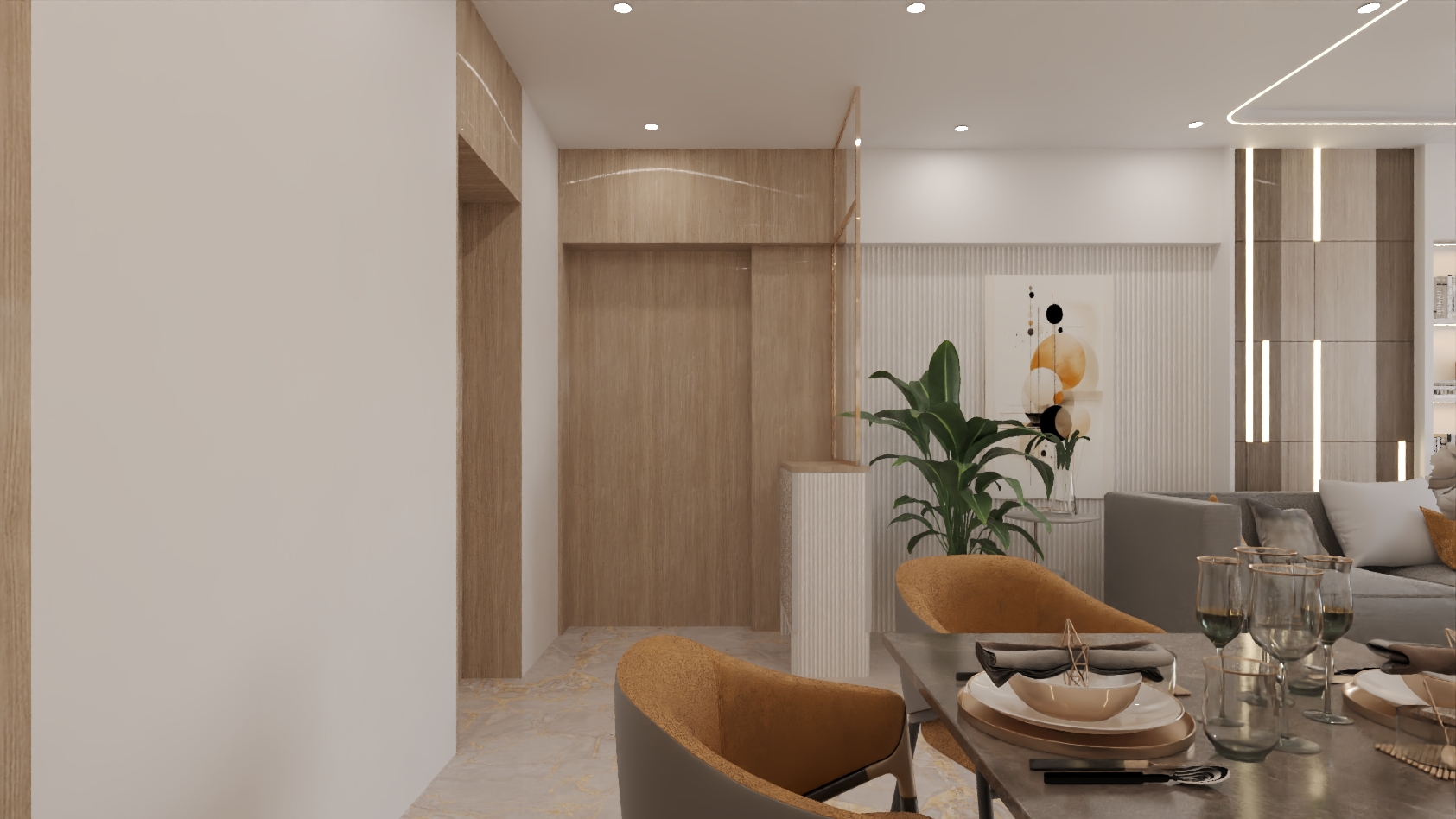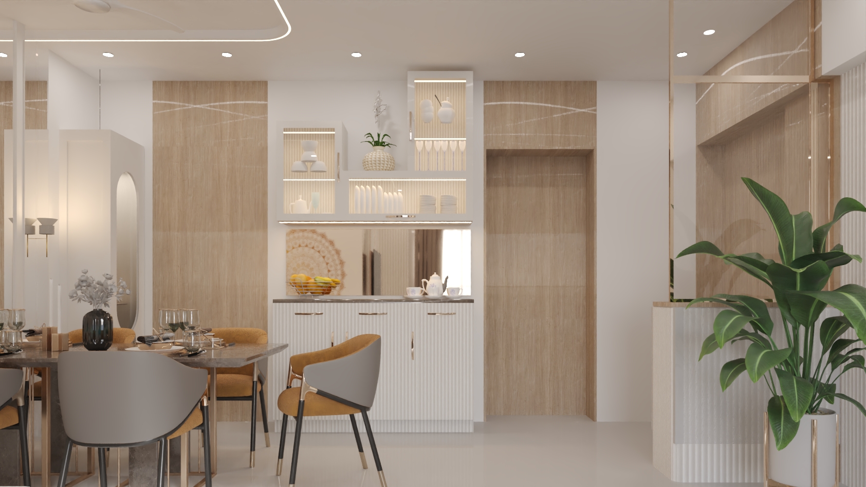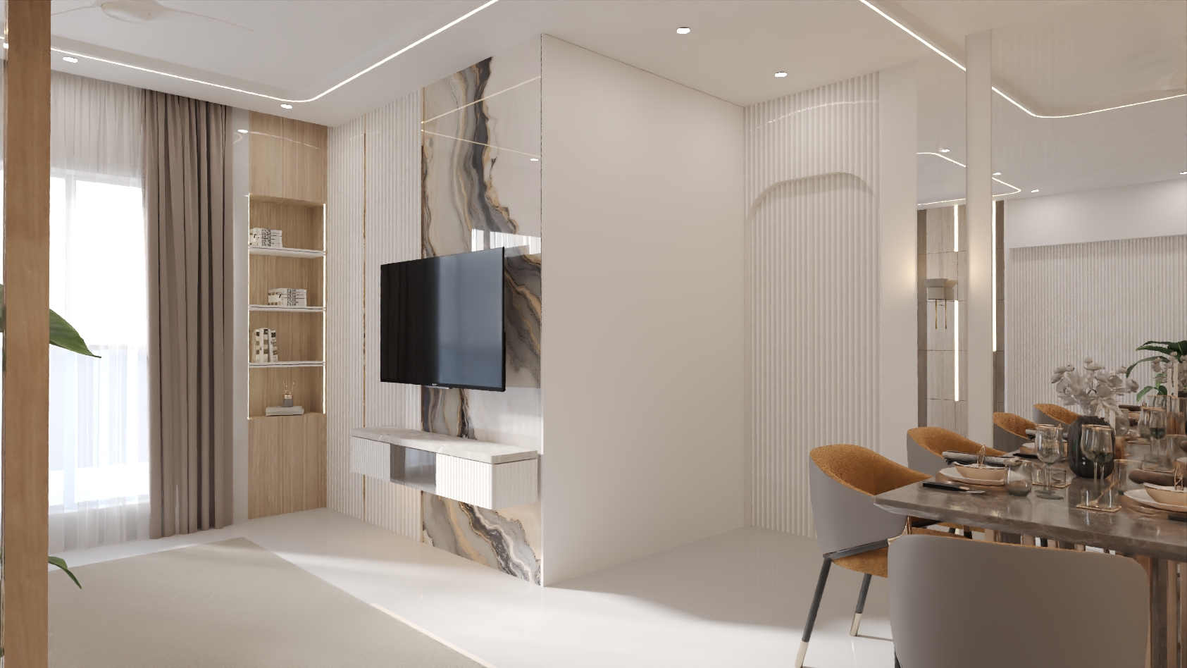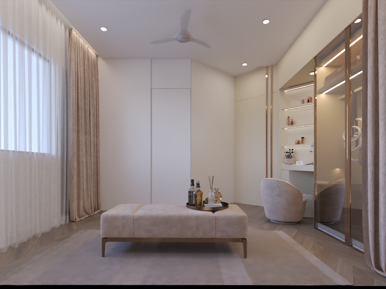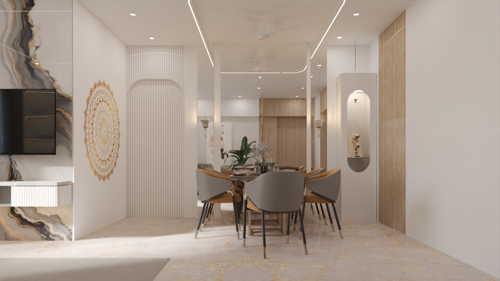 The design language blends soft neutrals, warm textures, and premium materials to create a home that feels expansive, refined, and emotionally comforting.