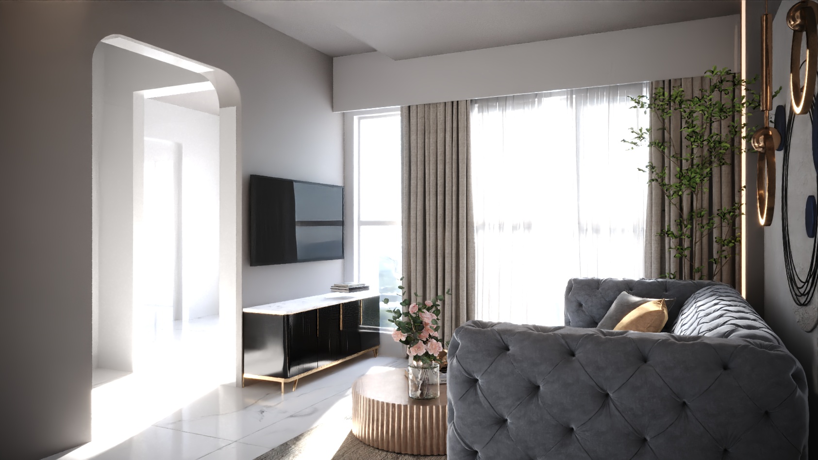 The space maintains a seamless flow, highlighted by sleek arches and muted wall tones that connect each zone without clutter.