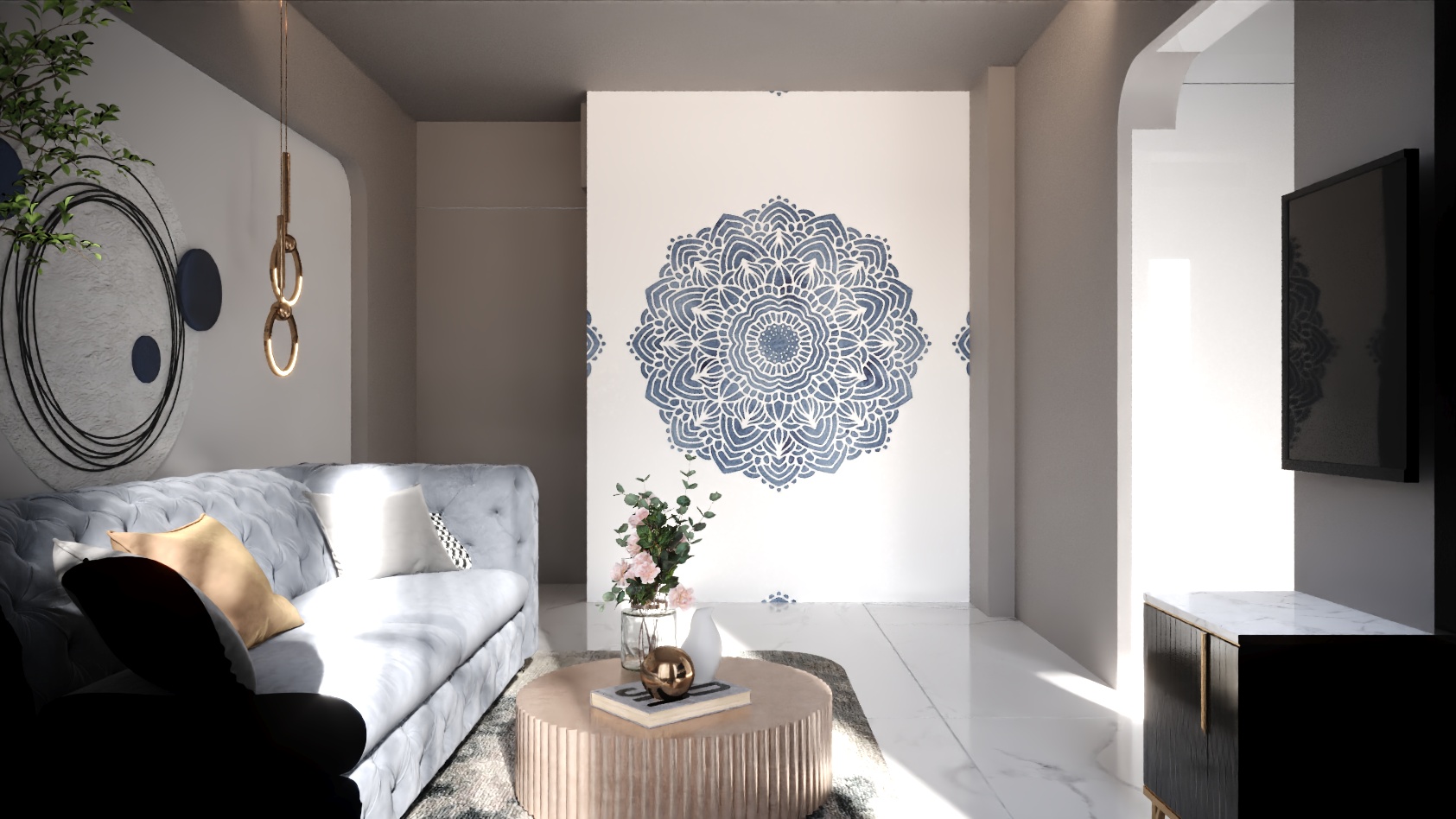 The living space features a plush tufted sofa set against a light-toned backdrop, complemented by curated artwork, sculptural lighting, and soft natural daylight. A round fluted coffee table, delicate floral accents, and greenery introduce warmth and balance. The mandala wall art and circular abstract composition add cultural charm and visual depth to the compact layout.