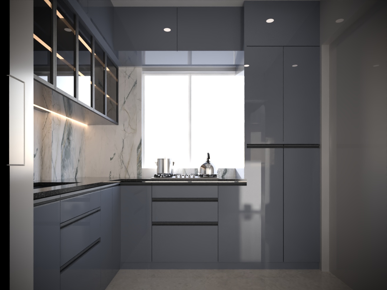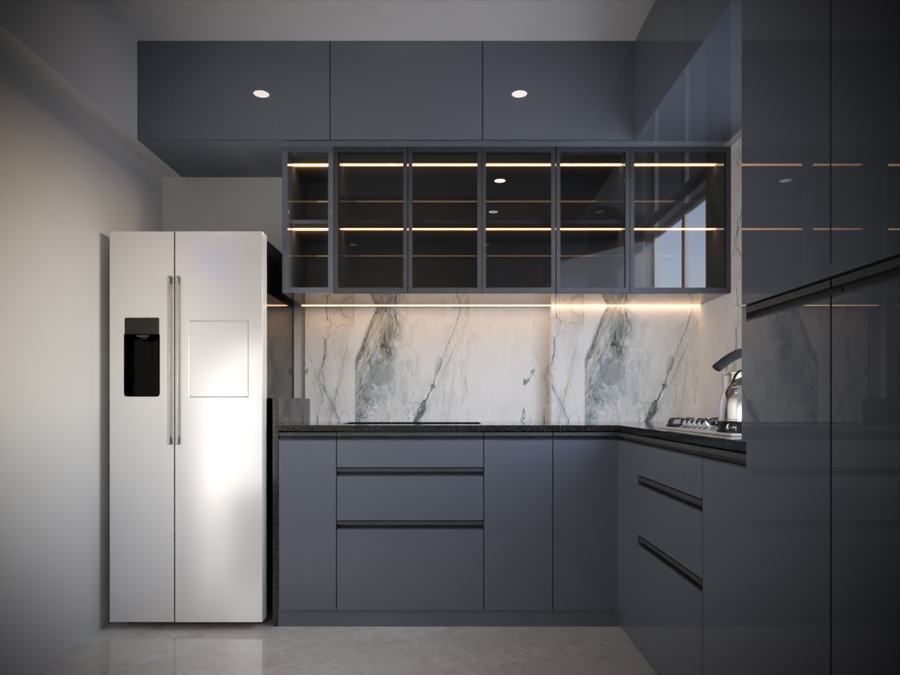 High-gloss graphite cabinetry, integrated lighting, and a premium marble backsplash create a sophisticated and highly functional culinary space.