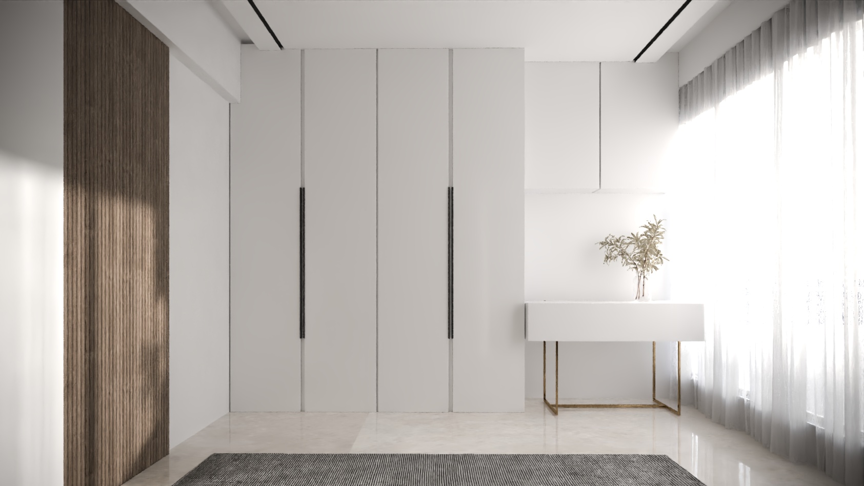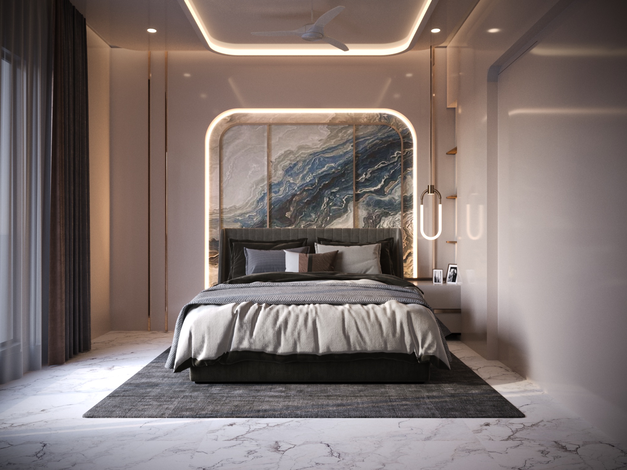 The TV unit pairs glossy black finishes with marble textures, bringing a contemporary contrast while keeping the ambience light and spacious