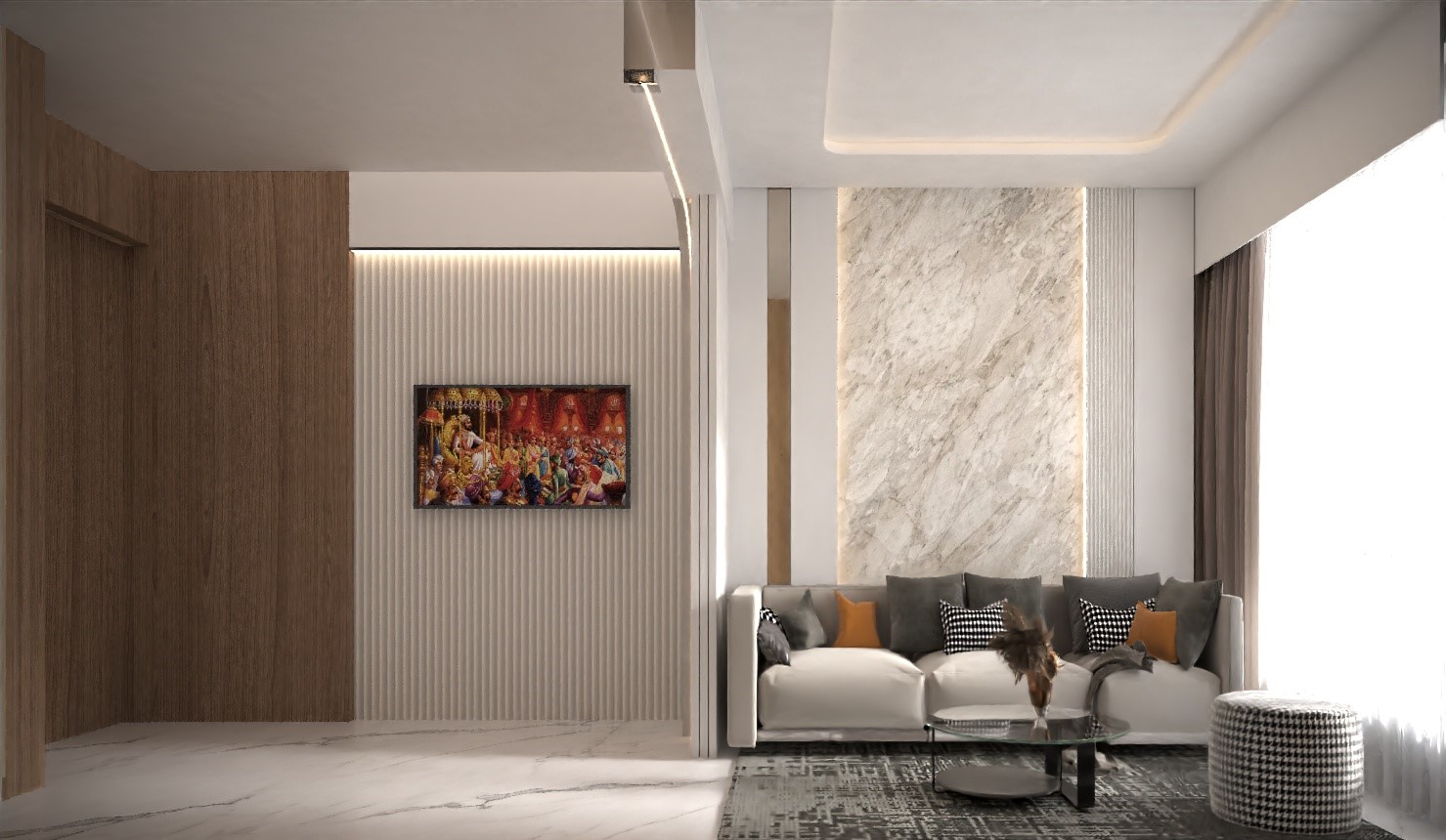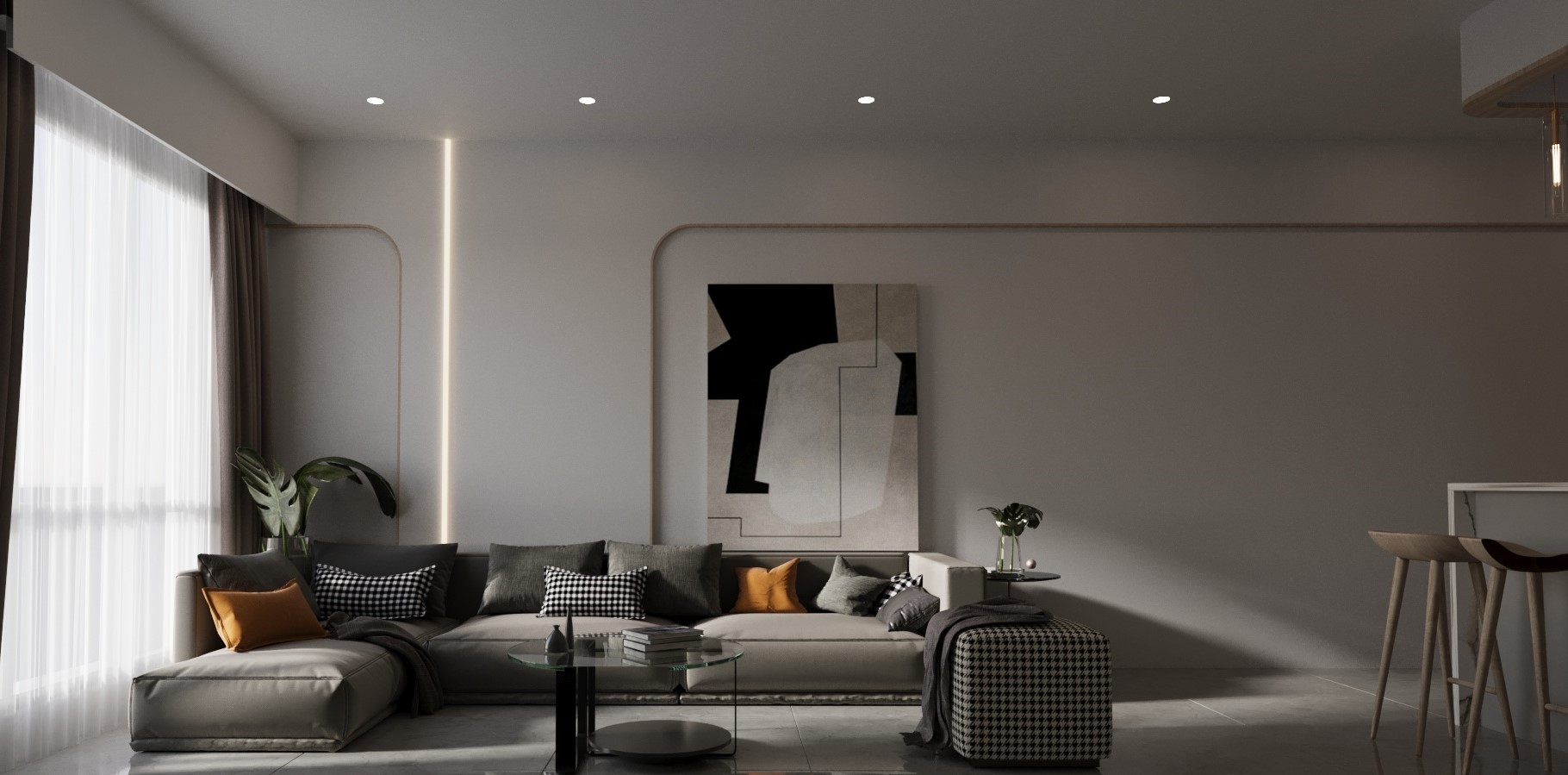 Lighting plays a crucial role in shaping the atmosphere. Integrated ceiling lighting, concealed LED details, and subtle wall illumination enhance textures and architectural elements while maintaining a soft, inviting ambience. Curved furniture edges, sculptural décor pieces, and minimal ornamentation reinforce the philosophy of quiet luxury — where simplicity, proportion, and thoughtful detailing define the design rather than excessive decoration.