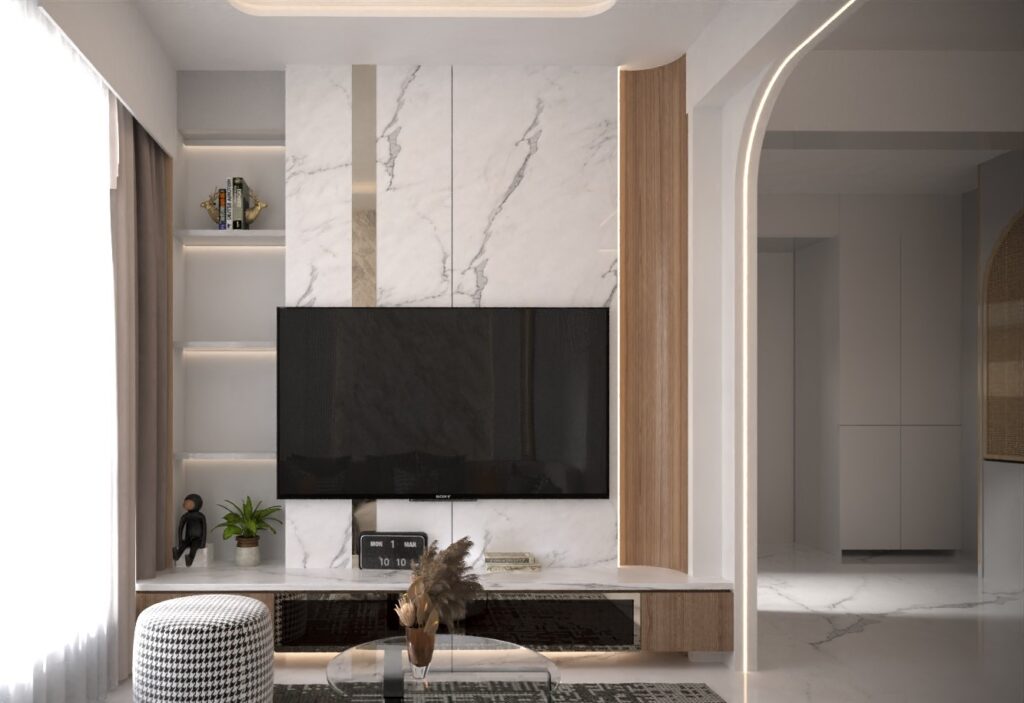 The final outcome is a refined and tranquil home that balances modern aesthetics with everyday comfort. The living space feels open and elegant, highlighted by layered textures, warm lighting, and carefully placed statement elements. The bedroom continues this language with a marble feature wall framed by warm wooden panels and soft lighting, creating a peaceful retreat within the home.